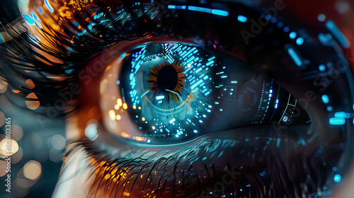 Detailed digital eye, holographic interface with glowing elements, futuristic design,