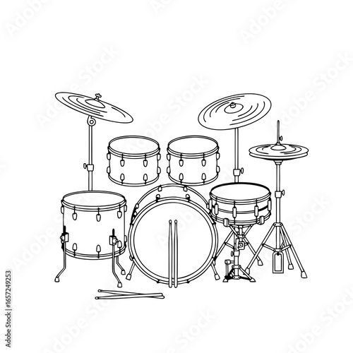 Detailed Drum Set Outline with Sticks and Cymbals.