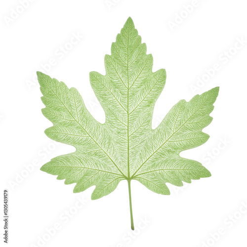Detailed elderberry leaf with intricate lobes and soft texture elegantly centered on white backdrop capturing its light and airy essence