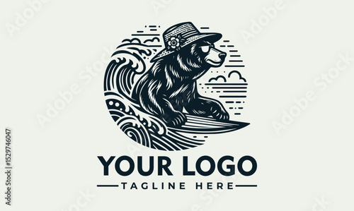 Detailed engraved illustration of a bear surfing on a wave with a sunburst and palm tree in a circular frame. Summer adventure concept