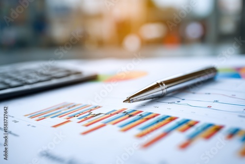 Detailed financial analysis of business audit reports with colorful graphs and charts emphasizing trends and key data insights in a modern office setting