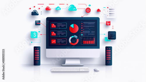 Detailed flat design illustration depicting network monitoring graphs and server statuses for IT professionals, showcasing data visualization and technology concepts.
