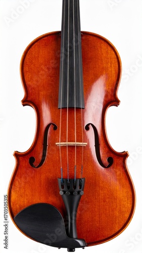 Detailed Front View of a Classic Wooden Violin with Warm Varnish and Black Fittings on White