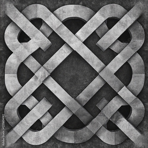 Detailed geometric metal design featuring Celtic knot patterns on a dark textured background, ideal for artistic and architectural projects.