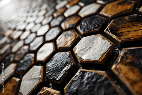 Detailed hexagonal wooden floor tiles arranged in an artistic pattern in a well-lit indoor space