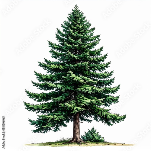Detailed Illustration of a Tall Green Coniferous Evergreen Tree on White Background