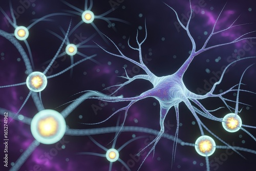 Detailed illustration of interconnected neurons forming a neural network with glowing synapses transmitting signals across the brain