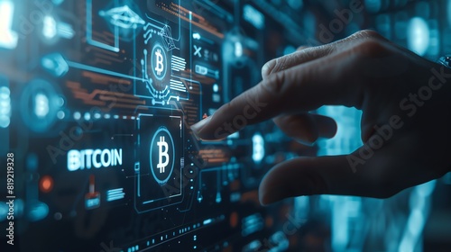 Detailed illustrations of bitcoin text on blue digital screen