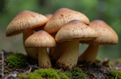 detailed image of Shiitake mushrooms in their natural forest habitat, emphasizing their distinctive brown, umbrella-like caps with intricate textural details.