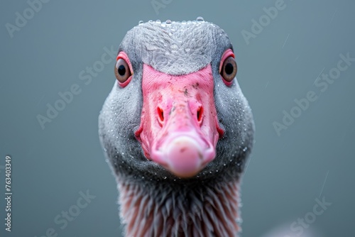 Detailed image showcasing a goose with pink beak and striking red eyes amidst rain droplets on feathers