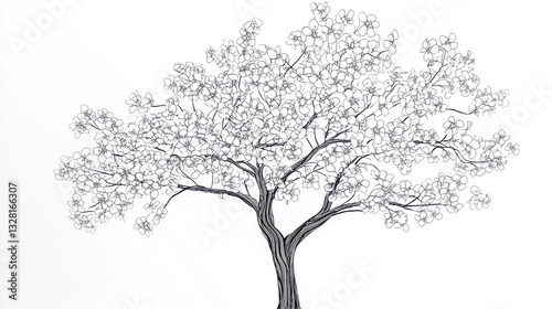 Detailed line drawing of a flowering tree against a plain background. Possible use Stock image for nature, design, or education