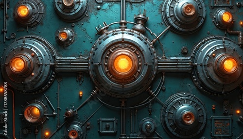 Detailed machine cyberpunk wall. Modern engine, tech system wallpaper. Computer power wires cables. Industrial material, science fiction, tech building. Abstract factory architecture, future