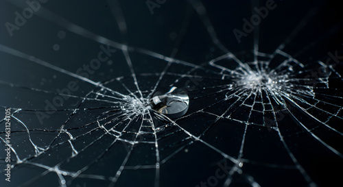 Detailed Macro Of Cracked Glass With A Water Droplet Refraction