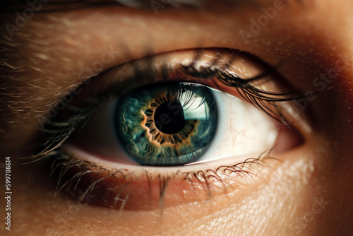 Detailed macro view of a beautiful female eye in stunning blue color. Close-up of the iris, pupil and lashes with focus on the optical anatomy. Perfect for of beauty and anatomy. AI Generative.