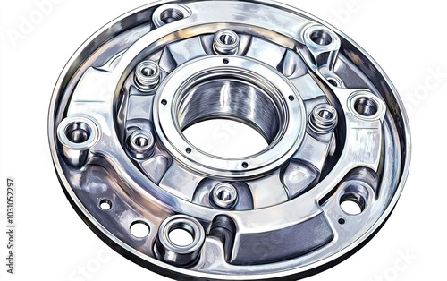 Detailed metal component displayed prominently on a white background, showcasing precision engineering and craftsmanship in manufacturing processes