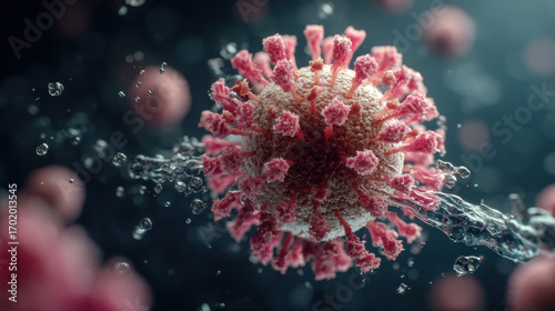 Detailed microscopic view of coronavirus virus particle, showing detailed structure and surface proteins, highlighting biological and medical aspects of infectious disease