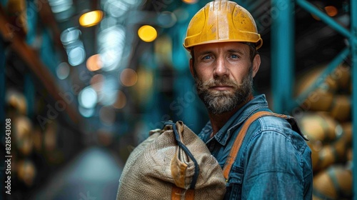 Detailed mockup of a laborer carrying a sack in a factory floor setting