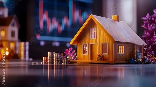 Detailed Model House Surrounded by Coins and Financial Graphs Representing Investment Strategies