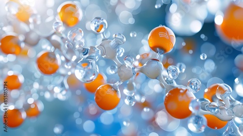 Detailed molecular model with orange and clear spheres, illuminated by bright lighting, representing molecular structure, focuses on pharmaceutical research, public health, vaccine development.