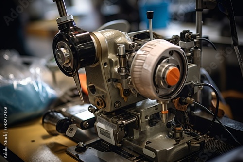 Detailed perspective of a stitcher head amidst the hum of a busy factory floor