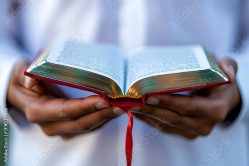 Detailed Photo Of Hands Holding Open Holy Book With Gold Pages And
