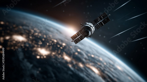 Detailed satellites orbiting above Earth, a space background filled with stars and meteor trails, a partially visible planet with city lights shining across the continents, the curvature of the Earth