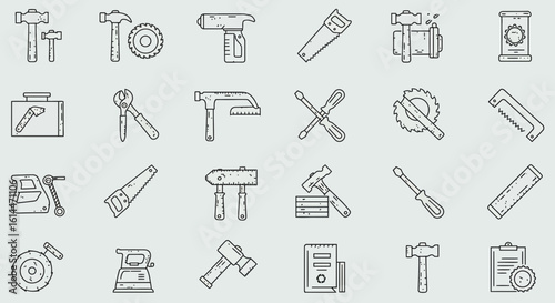 Detailed set of carpentry and woodwork tool icons in a simple outline style design
