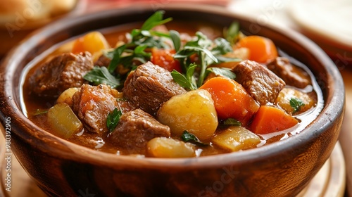 Detailed shot of a hearty beef stew with tender meat, vegetables, and a rich gravy, served in a rustic bowl, capturing the comforting and satisfying appearance