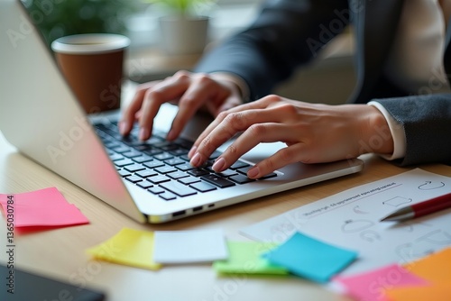 Detailed shot of a person's hands typing on a laptop keyboard, surrounded by colorful sticky notes and a cup of coffee on the desk.