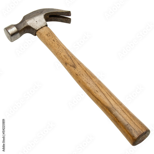 Detailed view of a claw hammer with a wooden handle isolated on a white background