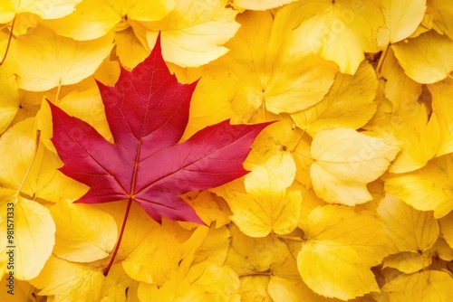 Detailed view of a crimson maple leaf resting on a layer of golden fall leaves with room for text display
