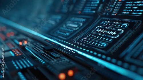 Detailed view of a futuristic train ticket with digital enhancements, with copy space