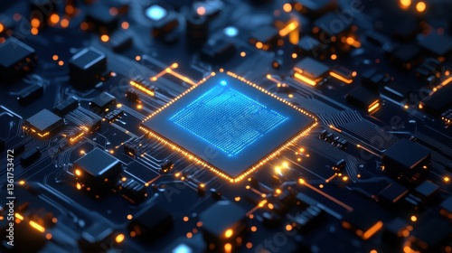 Detailed view of a glowing blue CPU on a dark circuit board. Use this for futuristic technology, data, or artificial intelligence topics.