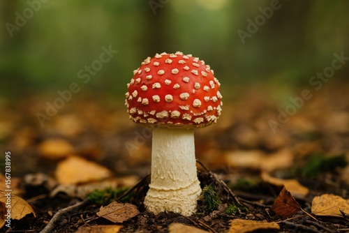 Detailed view of a vibrant red mushroom emerging from the woodland floor in autumn