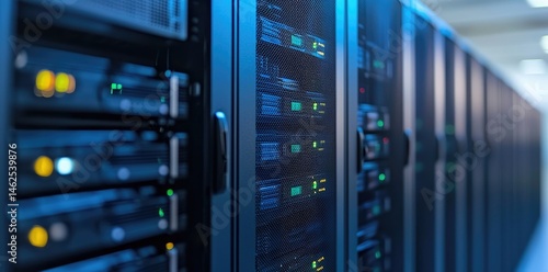 Detailed view of active server cabinets with vibrant LED status lights and metal mesh doors, ideal for visualizing secure data centers, IT hardware, or cloud computing setups