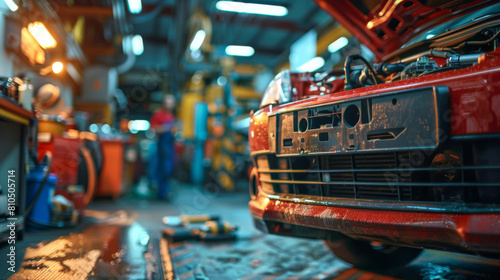 Detailed view of an automotive workshop featuring a classic red car undergoing maintenance.