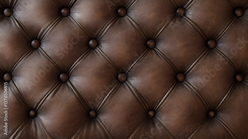 Detailed view of elegant brown leather upholstery with a classic tufted design and button accents, creating a luxurious and timeless texture.