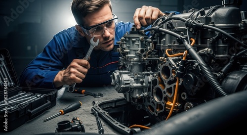 Detailed view of engine repair process with mechanic inspecting mechanical systems.