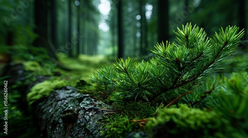 Detailed View of Forest Floor Vegetation Featuring Green Moss and Log
