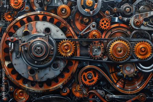 Detailed view of interconnected gears and machinery parts, illustrating industrial complexity and mechanical engineering..
