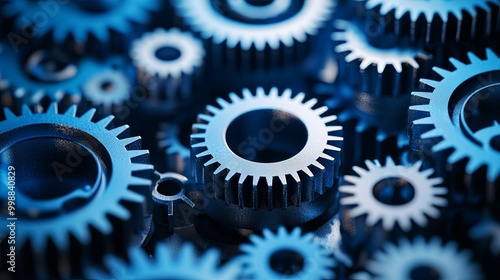 Detailed view of interlocking blue gears, representing cooperation and industrial machinery.