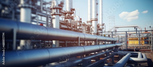 Detailed view of oil refinery equipment in an industrial zone, including pipelines and valves.