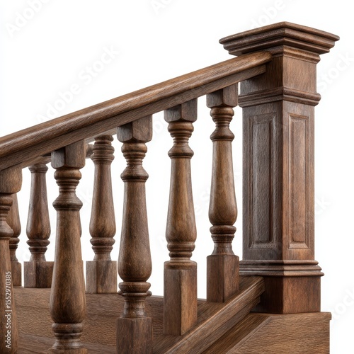Detailed view of ornate wooden staircase balusters and handrail isolated on white background
