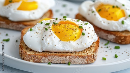 Detailed view of poached eggs on whole grain toast, preparation, protein-packed, 3D illustration
