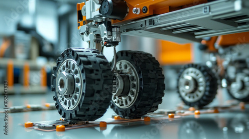 Detailed view of robotic wheels and sensors during assembly in a high-tech workshop