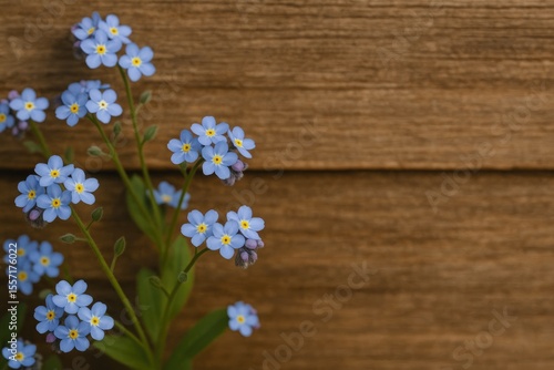 Detailed view of wild forget-me-not blossoms in a garden setting with rustic wooden backdrop and space for text