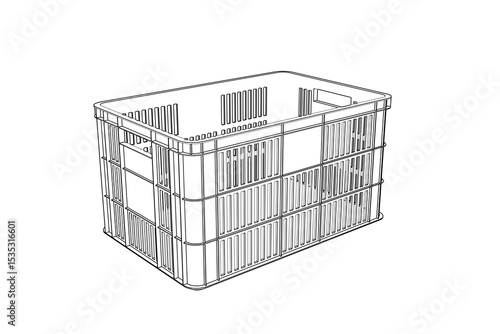 Detailed Wireframe Line Drawing of Plastic Carrying Crate - Monochrome Technical Illustration for Warehouse Storage and Transport Packaging - Simple Outline Schematic Vector Design Element Isolated
