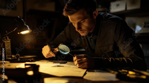 Detective in a dimly lit room, studying a case with a magnifying glass. Featuring focus and attention to detail