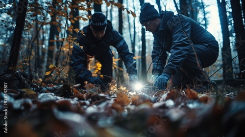 Detectives collecting evidence in a crime scene. Forensic specialists making expertise. Police officers and investigation in forest. Ai-generated.