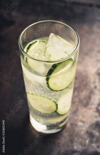 Detox beverage with cucumber slices on the rustic background. Selective focus. Shallow depth of field.